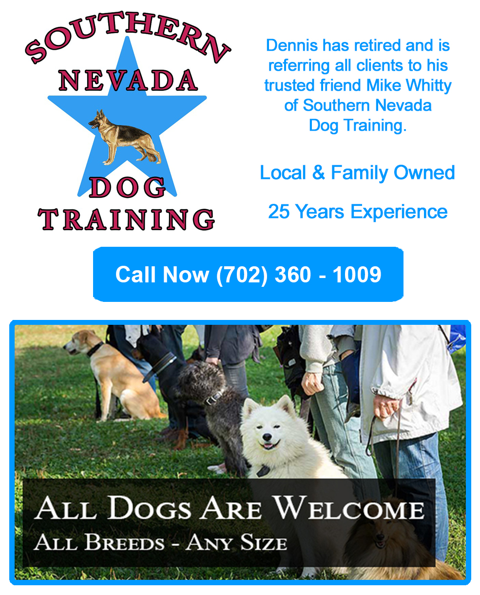 At home dog training Las Vegas. First Visit is Free! Dog trainer Las Vegas with 40 years experience. We use only humane dog training techniques. New puppy? Call the best dog trainer in Las Vegas! (702) 602 - 8841. | |||||||